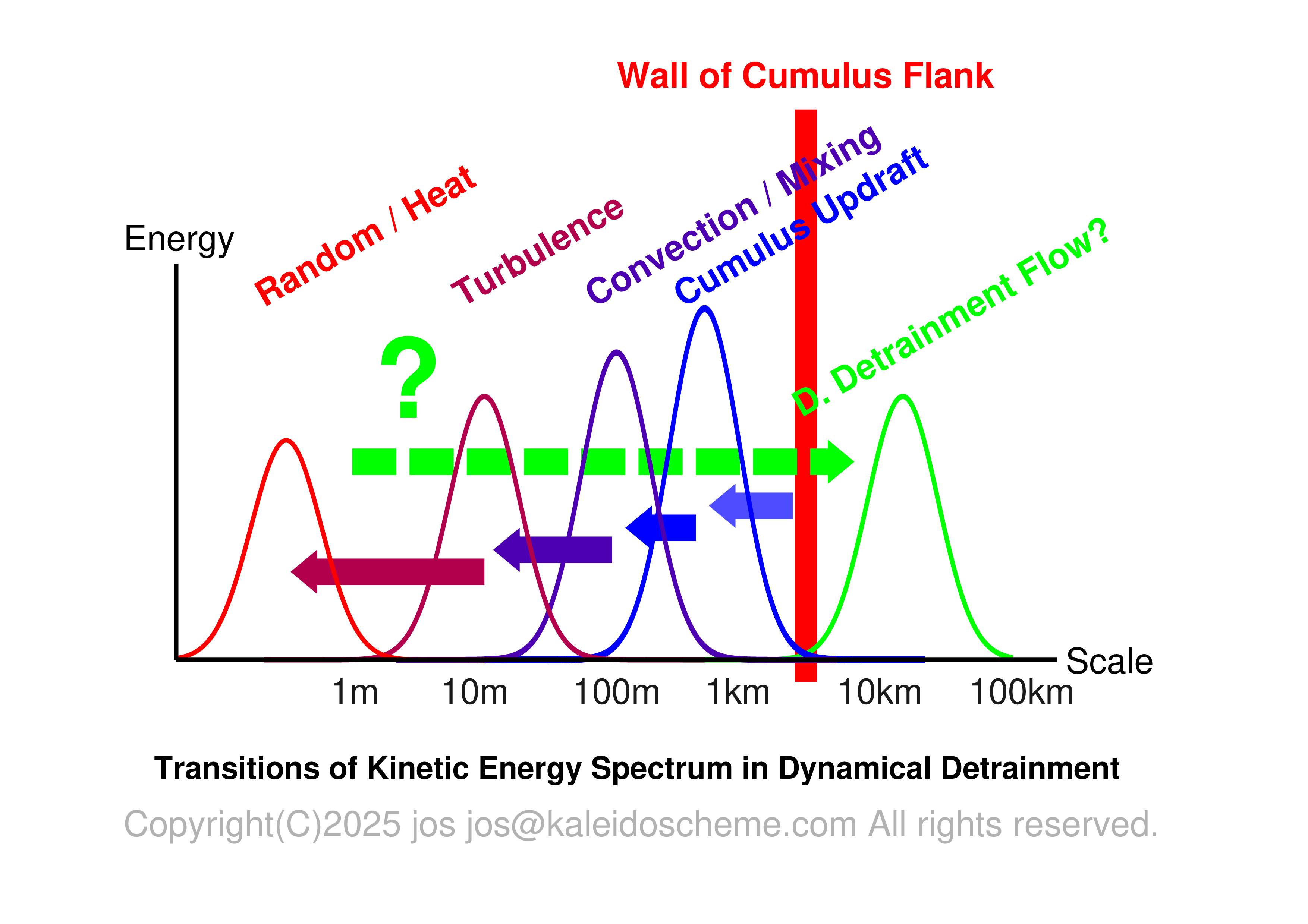 One could argue that the dynamical flow can pass through the flank wall of a cumulus cloud, even without enlarging the scale of KES. However, it is just turbulence passing through the flank wall. It is not a detrainment flow. If this turbulent flow could exit the cloud, it would disperse into even smaller turbulence. Such turbulent flow is inefficient for transport.